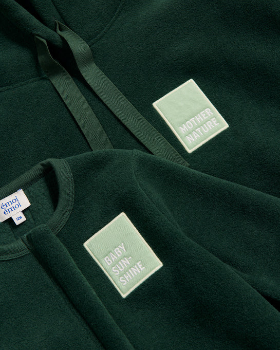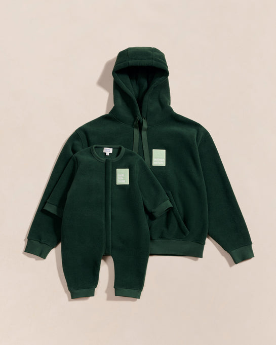 Pour cette édition limitée, on a choisi un vert nuit profond, la plus belle couleur de la saison et des coupes parfaites pour s’étirer, se lover, allaiter, se câliner.